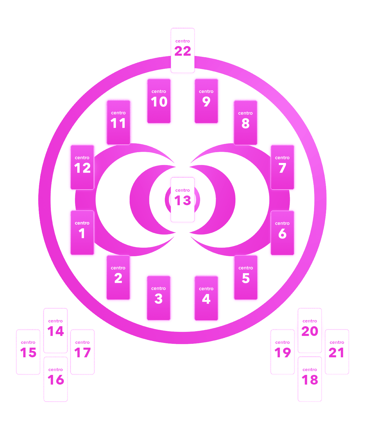 cada uno de los 22 centros puede albergar uno de los 22 arcanos, generando diez campos de información como su significado, su mensaje o dinámica